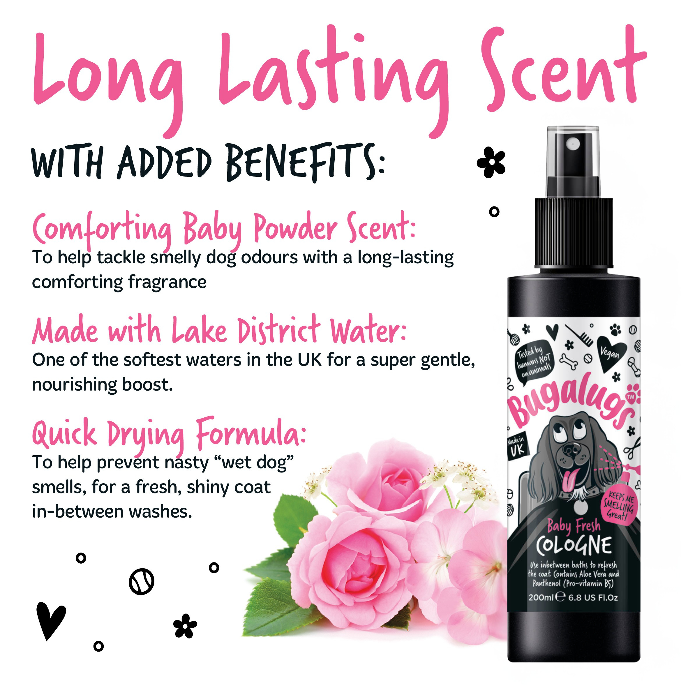 Enriched with the natural goodness of Aloe Vera and Pro-Vitamin B5, Bugalugs Baby Fresh Cologne, or ‘doggy perfume’ as it’s often referred to, goes beyond just scent. Aloe Vera’s soothing properties calm and comfort your pet’s skin, while Pro-Vitamin B5 promotes a lustrous and healthy coat. Plus, our vegan-friendly, pH-balanced formula is safe and effective for dogs of all breeds, including puppies over 8 weeks old. Our customer’s love our ‘baby smell spray’.