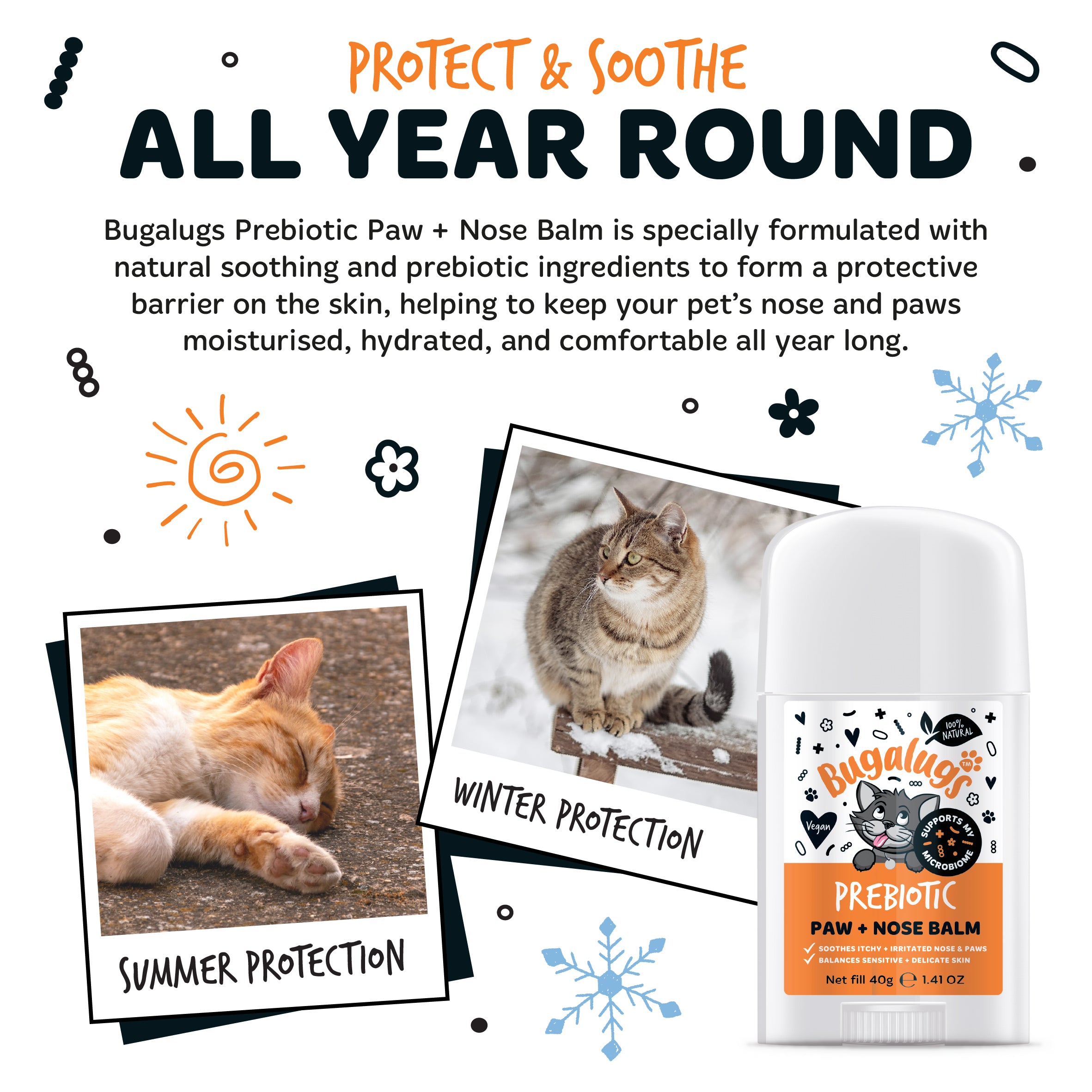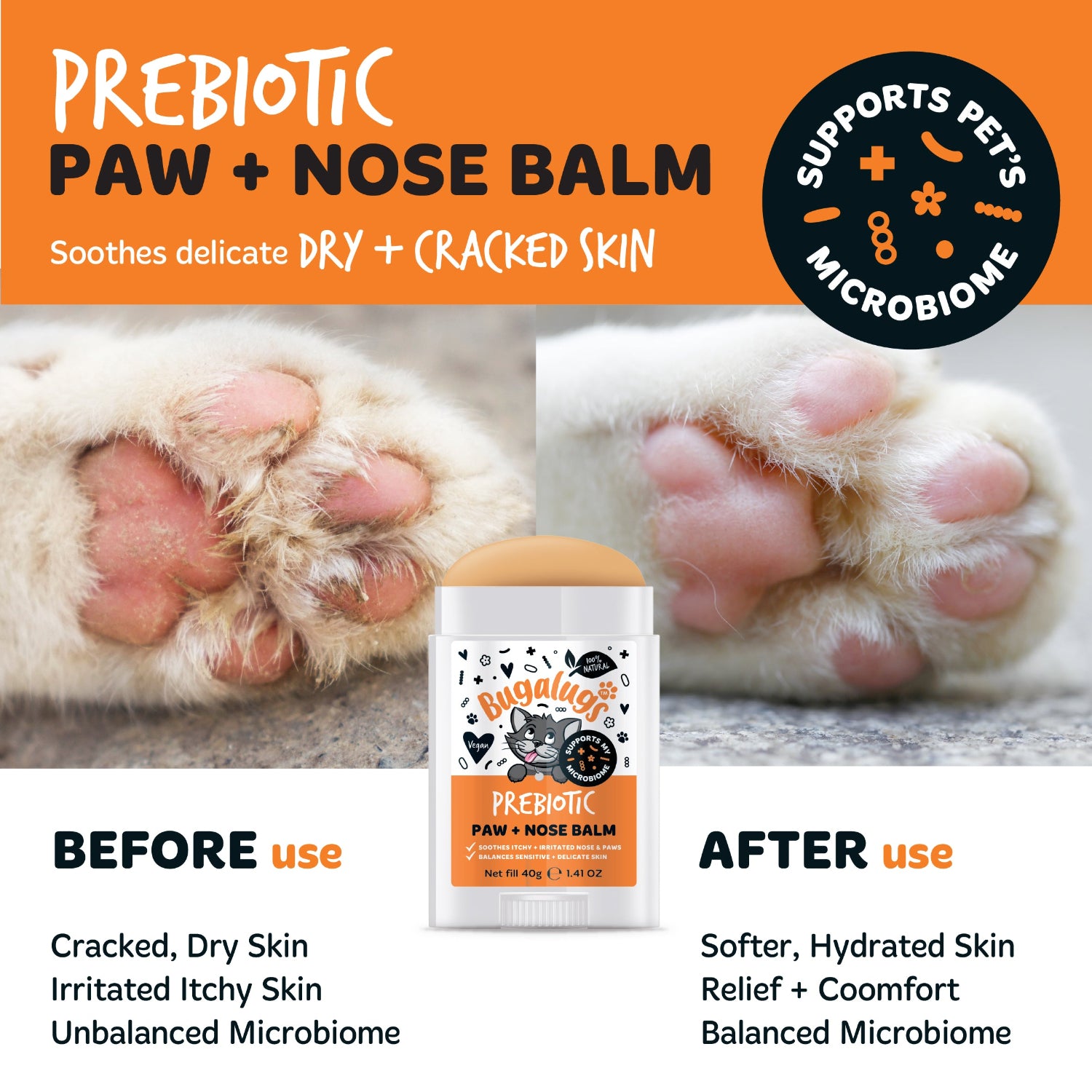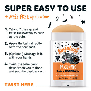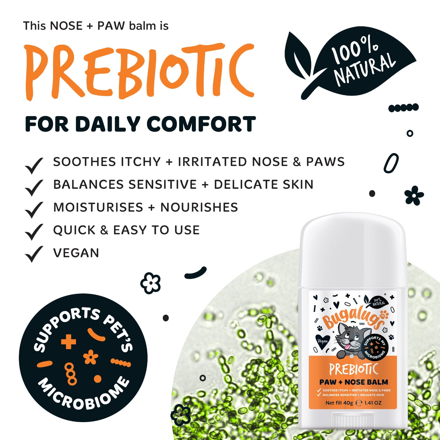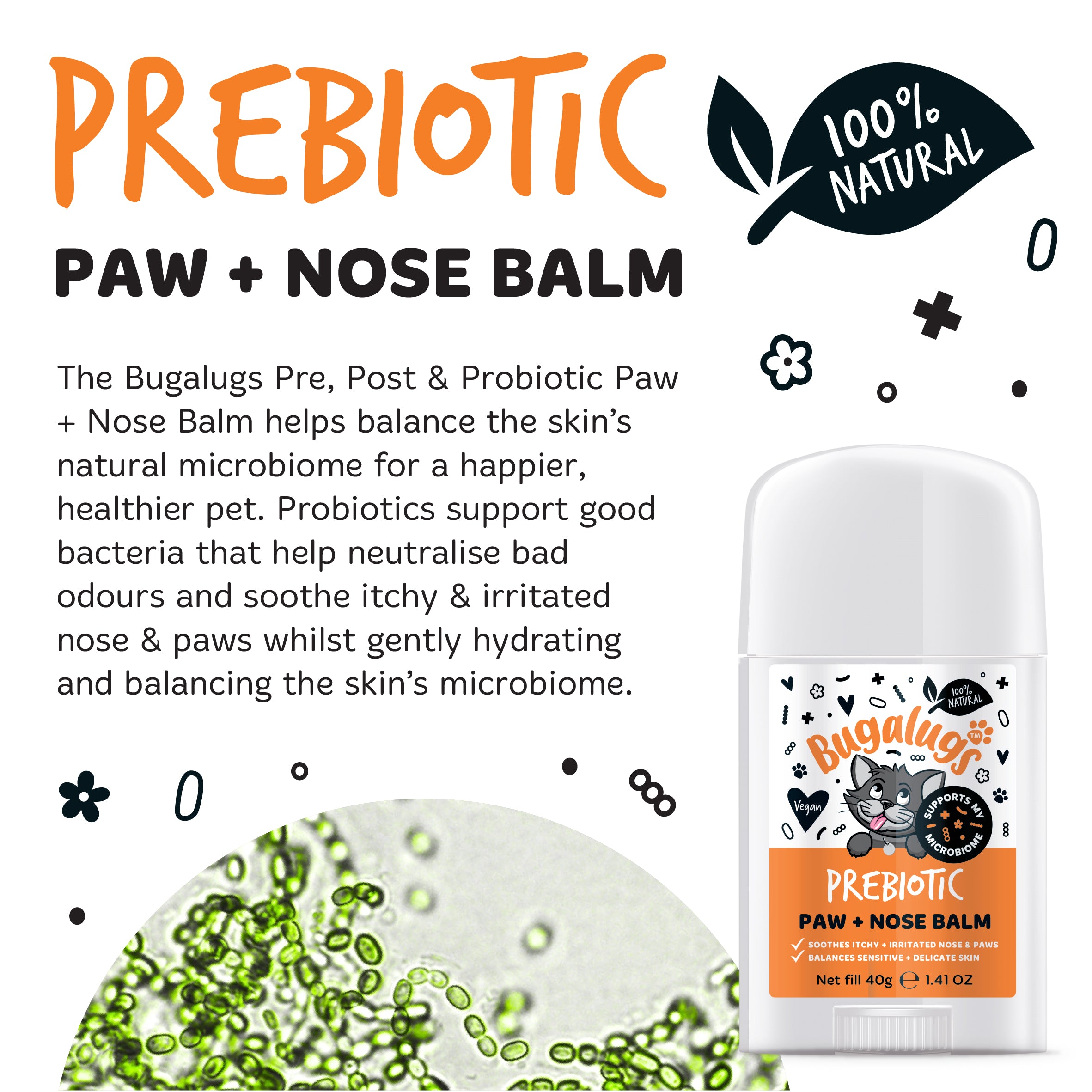 Bugalugs Prebiotic Paw + Nose Balm is specially formulated to support the natural microbiome of your pet’s paws and nose. Prebiotics nourish beneficial skin bacteria to help neutralise unwanted odours, calm irritation, and maintain healthy, balanced skin.