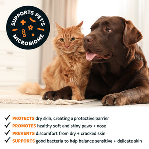 Rich in natural oils, oats, flaxseed, pumpkin, and aloe vera, this balm also moisturises and protects delicate skin, helping to soothe dryness, itching, and redness. Perfect for sensitive or irritated areas, it keeps paws and noses soft, happy, and healthy — whether after walks, playtime, or daily care.